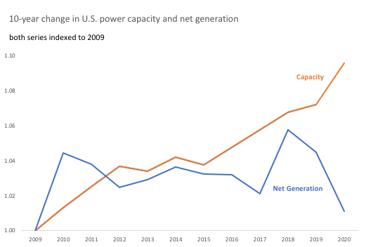 Yet analysts forecasting rapid growth in renewable capacity rarely, if ever, consider the implications of aggregate capacity and its potential impact on wholesale power prices when they plot their expected growth rates. Their assumptions are most often based on steady or even higher energy prices, which may seem more likely today given the recent bottoming in 2020. But this would be inconsistent with everything we’ve learned from the past. Growing supply and flat demand are more likely to continue to push prices lower, not higher.