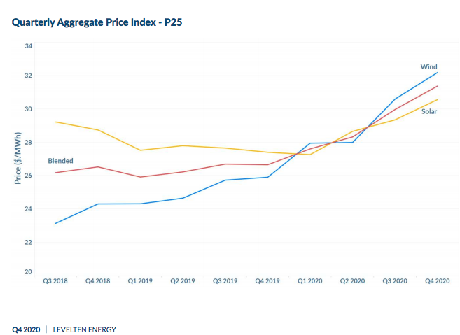 In forward markets, a similar dynamic (more sellers than buyers) has been playing out, and these markets have more direct implications for the availability of capital to fund the next generation of renewable assets. The vast majority of the new capacity is project-financed and needs to be hedged several years forward in order to lock in their economics. There have not been enough long-term buyers to offset the generators’ selling interest, so long-term prices also followed a multi-year downward trajectory – until 2020. Like spot prices, the decline in long-term power prices also found a bottom last year that some observers have taken as a sign of a looming rebound. The chart below shows quarterly PPA offer levels from LevelTen Energy’s latest index update.